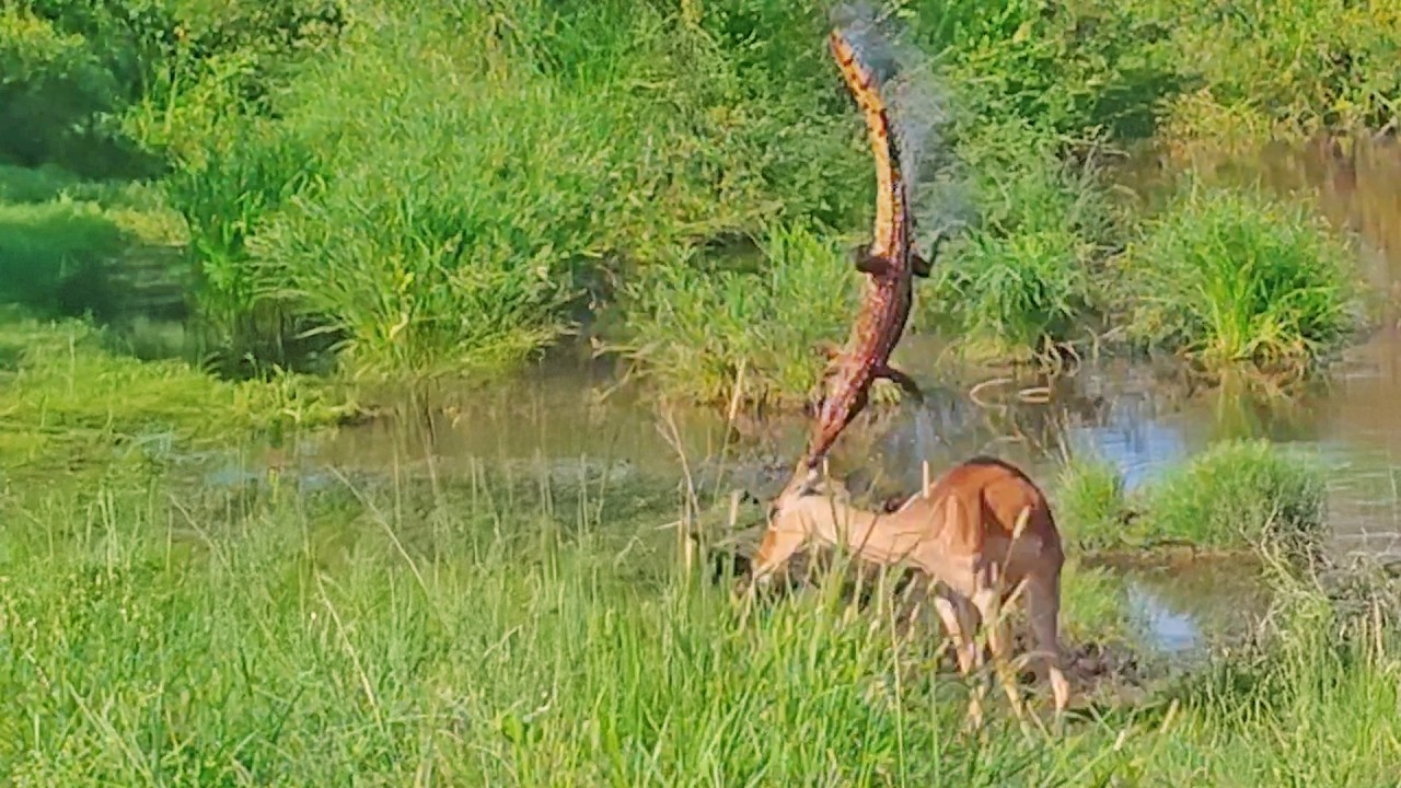 In a dramatic turn of events at a Kruger National Park watering hole, a crocodile’s hunting strategy backfired spectacularly. The predator attempted to ambush an unsuspecting impala, but what happened next was nothing short of extraordinary. When the crocodile latched onto the impala’s ear, the powerful buck unleashed a devastating kick that sent the reptile flying through the air. This incredible moment captures the raw intensity of African wildlife, where survival depends on split-second reactions and sheer determination. The impala’s quick reflexes and strength proved to be the perfect defense against one of Africa’s most formidable predators. Watch this jaw-dropping encounter that reminds us why the African bush is one of nature’s most unpredictable arenas.